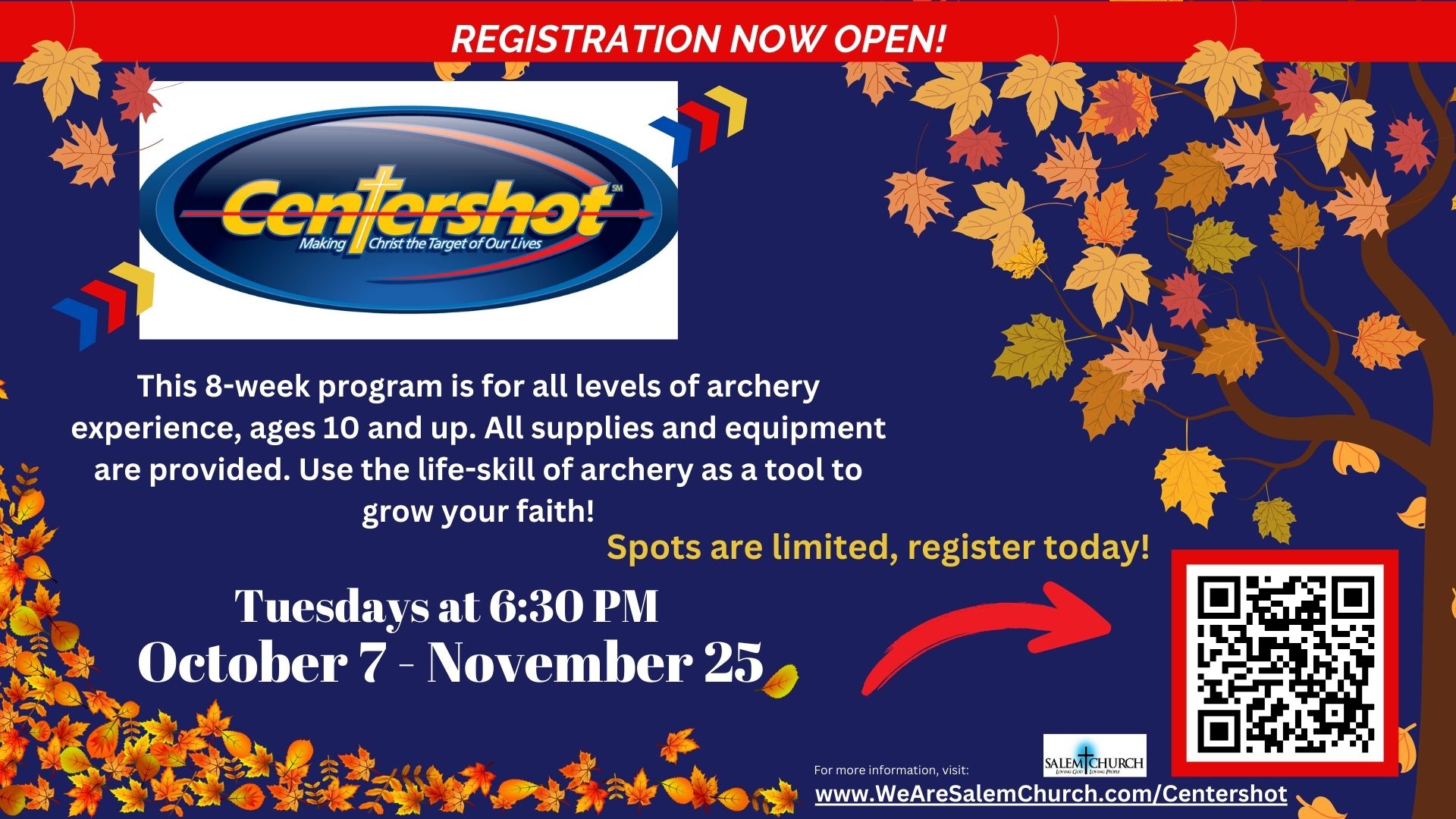 This is an 8-week course for shooters age 10 through senior adults. Whether you are new to archery or an expert marksman, come learn the basics of archery, hone your shooting skill, and practice the discipline of the sport with your family and friends as well as enjoy a devotional and snack time together. The group meets weekly on Tuesday evenings for 8 weeks. No equipment or experience necessary! Make Christ the target of your life!