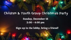 All kids and youth are invited to join us for a Christmas Party from 2:00 – 4:00 PM!  Children who are potty-trained and up are invited to come for a fun and festive time celebrating the real reason for the season.  No cost, feel free to bring a friend!