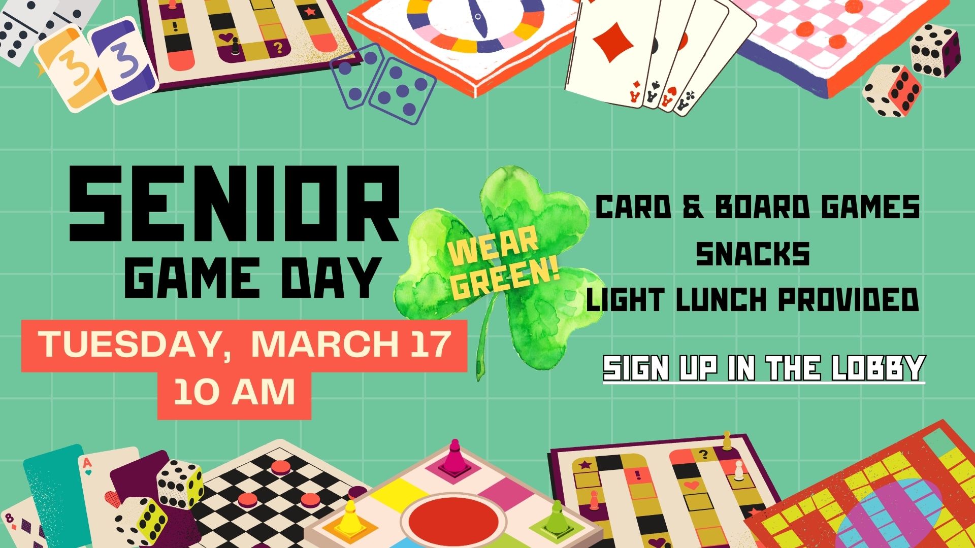 will be held on Tuesday, March 17 at 10:00 AM. Wear green! Please sign up in the lobby to attend, invite a friend!