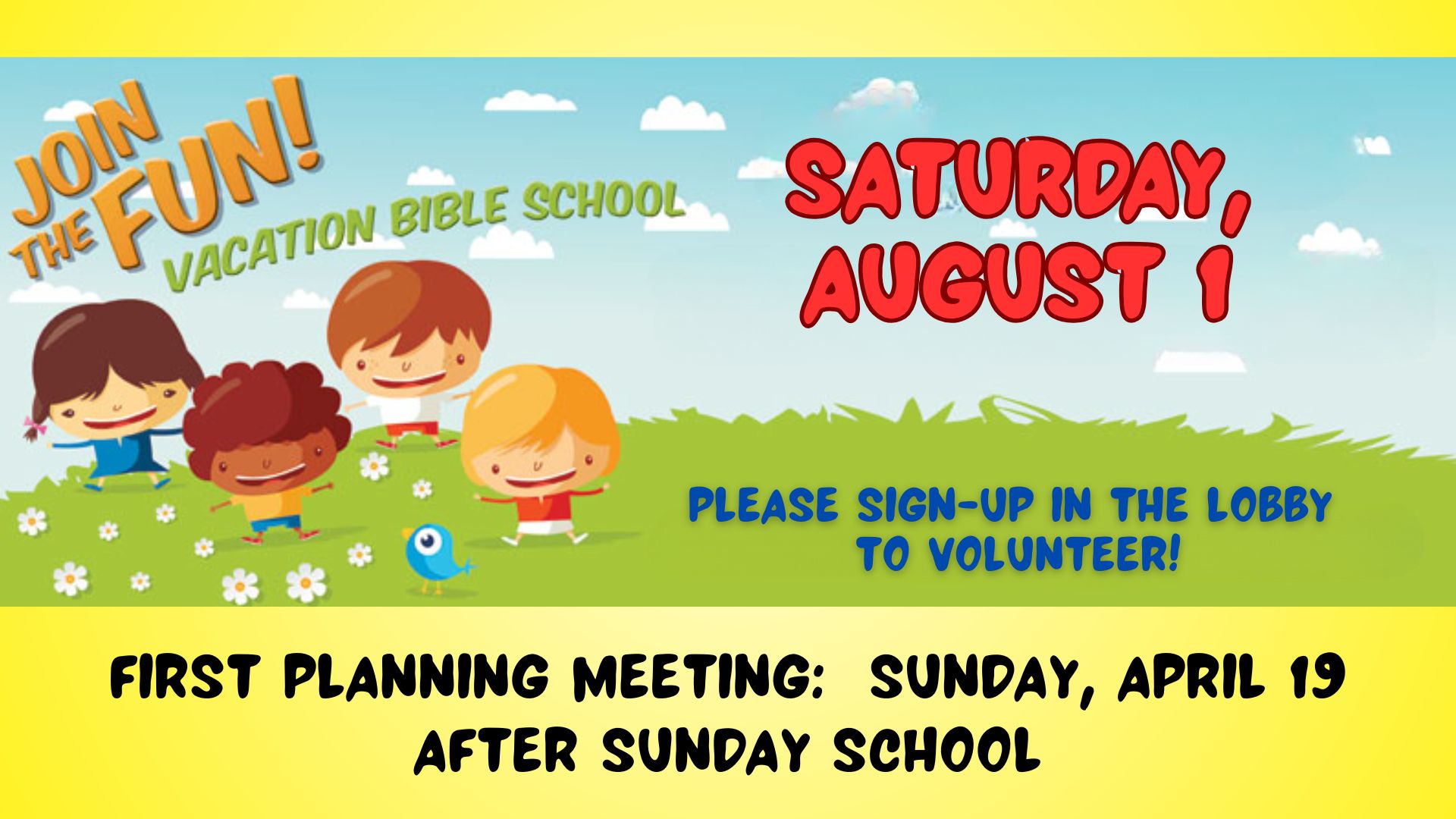 A VBS planning meeting will be held on Sunday, April 19th following Sunday School.  Please sign up in the lobby to indicate that you are able to help with this year's VBS to be held on Saturday, August 1st.