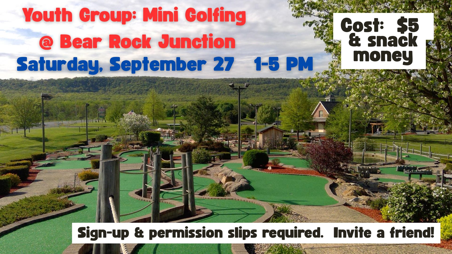 Youth Group kids (grades 6-12) are welcome to attend a trip to Bear Rock Junction for mini-golfing and ice cream. Friends are welcome, RSVP and signed permission slips are required. Cost is $5 to help cover the cost of mini-golf, kids can bring extra money for ice cream and/or snacks.