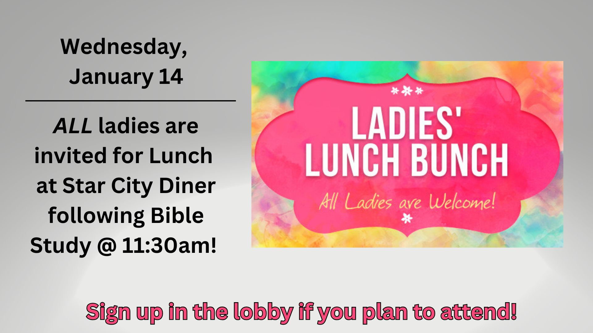 All ladies are welcome to join the group at Star City Diner following Morning Bible Study. Please sign up in the lobby to join.